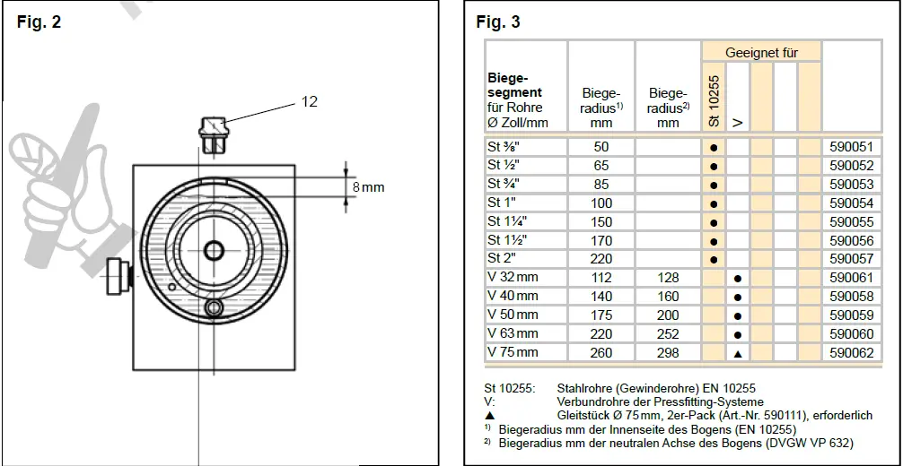 - Steel pipes of the press fitting systems with aluminum bending formers, see fi g. 8 Ø 15 – 22 mm, s ≤ 1.5 mm
