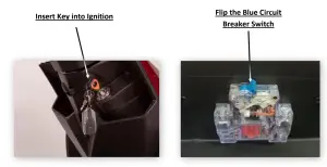 Before using your scooter for the first time, you must turn on the circuit breaker switch which is located underneath the seat. To access the circuit breaker, insert the key into the ignition, and without pushing in further, turn the key counterclockwise (left). You will hear the seat latch release, and you can now lift up the back of the seat to access the circuit breaker.