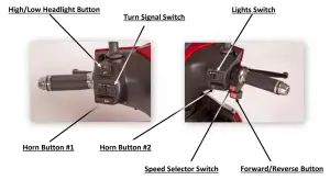 Always ensure that the power is switched off when getting on or off the scooter. Never attempt to mount or dismount the scooter if it is operational or moving. Do not switch the power off when the scooter is still moving forward or in reverse. Always check that the variable speed switch is set to the desired speed setting. Always check that the desired direction of forward or reverse travel is selected when ready to drive.