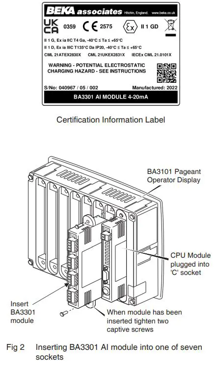 The certification information label is fitted to the side of the plug-in BA3301 module. It shows the model number, certification information, BEKA associates address and year of manufacture together with the serial number.