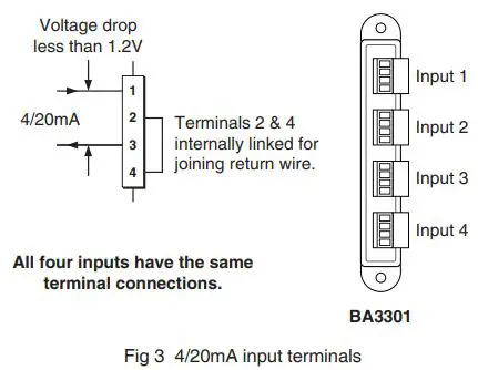 Terminals 2 and 4 of each BA3301 input are internally linked for joining the return 4/20mA wire as shown in Fig 4.