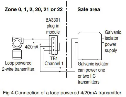Loop powered transmitters should be powered from a galvanic isolator or Zener barrier with output safety parameters compatible with the transmitter’s and the BA3301’s intrinsic safety input parameters. The output parameters of each BA3301 4/20mA loop are zero and the internal inductance is very small and can be ignored when determining the loops safety.