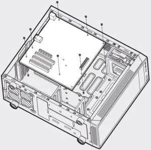 First, install your motherboard’s I/O shield (see your motherboard’s manual for guidance). Align your motherboard with the pre-installed standoff s. Use the provided screws to secure the motherboard to the motherboard tray.