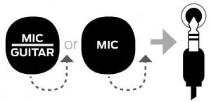 - Connect an instrument, microphone, or other device to the MIC/GUITAR or MIC port(s) with a standard 6.35 mm jack.