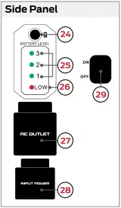 - Flashing RED LED indicates the battery is very low and needs to be charged.