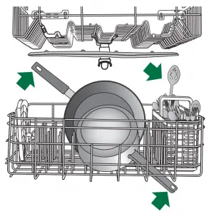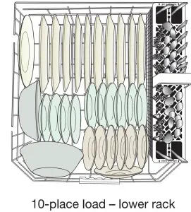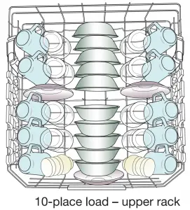 - Items should be loaded with soiled surfaces facing down and inward to the spray as shown in the graphics above. This will improve cleaning and drying results. Angle dirtiest dish surface downward, allowing space for water to flow up through rack and between dishes.