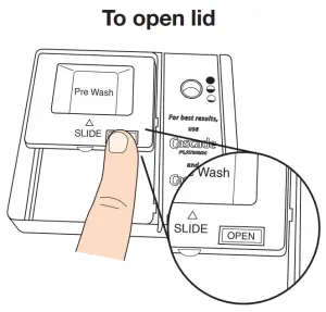 - To add rinse aid, open the dispenser lid by gently pushing in the center of the lid with your thumb while lifting up on the edge.