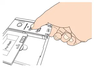 Place selected detergent in the dispenser. Place finger, as shown, and slide lid closed. Press firmly until it clicks.