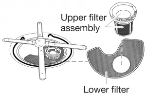 IMPORTANT: To avoid damage to dishwasher, do not operate your dishwasher without filters properly installed. Be sure lower filter is securely in place and upper filter assembly is locked into place. If upper assembly turns freely, it is not locked into place. The filters may need to be cleaned when: