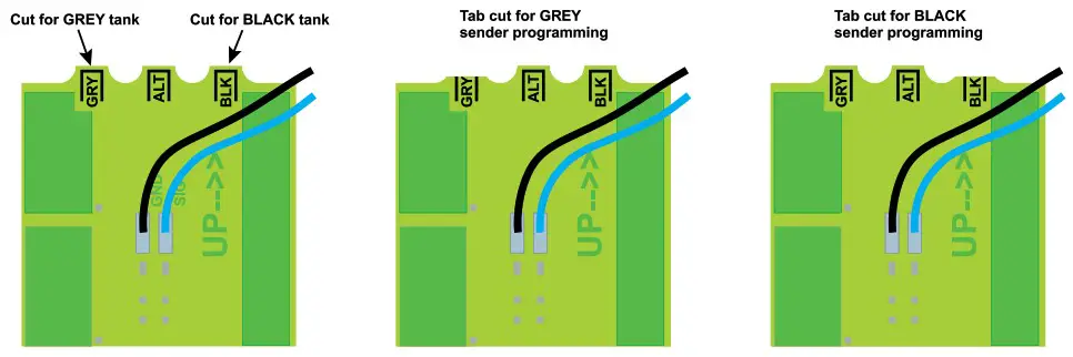 - On fresh tanks there is sometimes a potential to not be able to use all the water in the tank, we suggest you elevate the fresh sender 1″ off the tank bottom and position the top of the sender to allow for vent position (if the vent is on the side of the tank). This way you should see `0′ before the pump starts to suck air. Some tanks have a sump style draw system, in this case there is no concern with unusable water, just allow for the wall thickness when positioning the sender board (usually ½” to 1″ margin from the outer shell). If the sender is positioned above the vent then the maximum reading may be less than 100%.