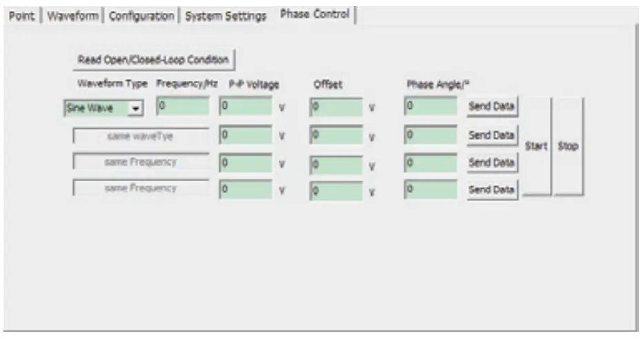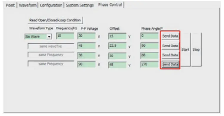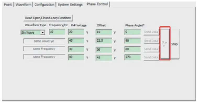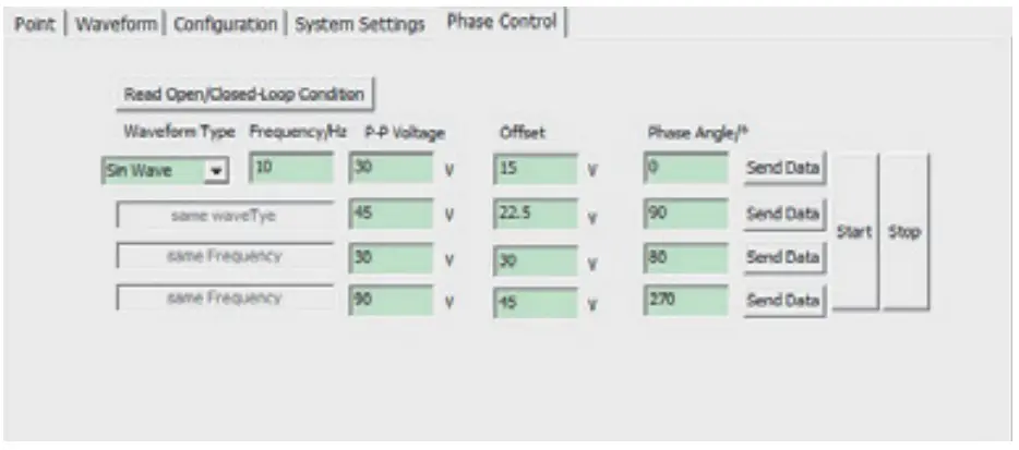 - Phase wavefor control mode: select the waveform, then fill in the frequency, P-P voltage, offset, phase angle and then fill in the related data of other channels, click” Send data”(this time just store the waveform data value of the data to be sent to the piezo controller), click”Start”, the piezo controller receive the execution waveform sending command of the trigger command.