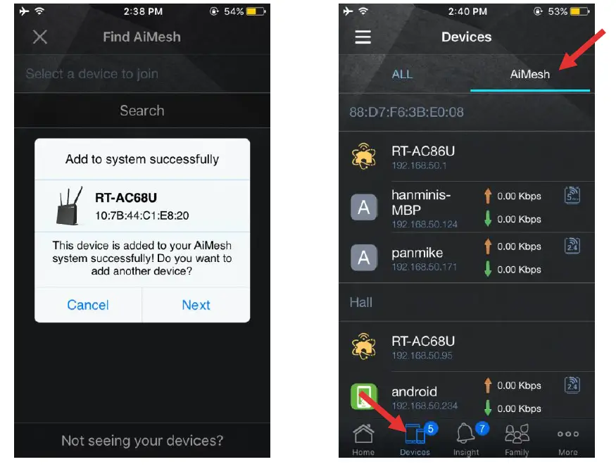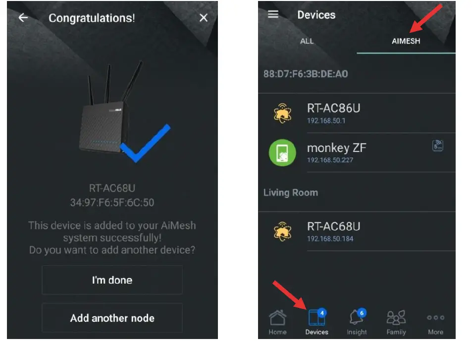 - Congratulation! You can find below pages show up when AiMesh node has successfully been added to the AiMesh network. Go to Devices AiMesh for more information.