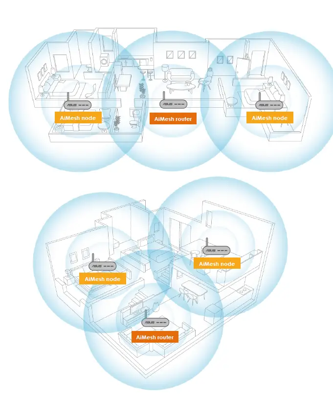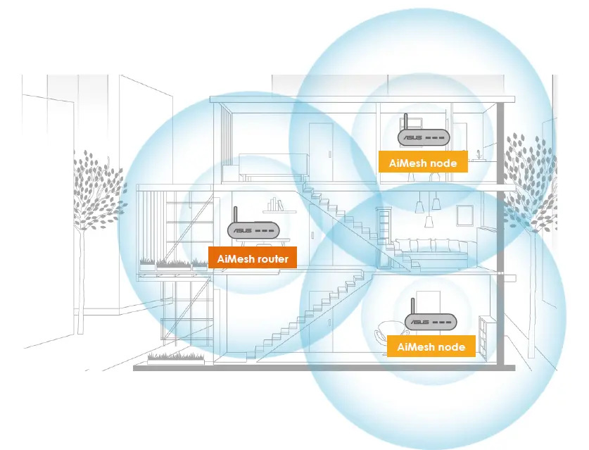 AiMesh system supports both wireless and wired connections between AiMesh router and node to maximize throughput and stability. AiMesh analyzes the wireless signal strength for each frequency band available and then determines automatically whether a wireless or wired connection is best to serve as the inter-router connection backbone.