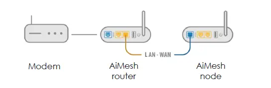 - Place the node in the ideal locations for best coverage. Run Ethernet cables from the LAN port of the AiMesh router to the WAN port of AiMesh node. AiMesh system will auto-select the best path for data transmission, whether wired or wireless.