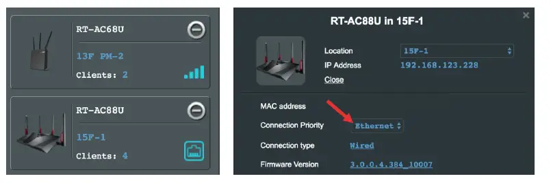 - If you want to keep wired connection manually between the AiMesh router and node, launch web GUI http://router.asus.com, and go to Network Map. Click on AiMesh icon, you will find the node list at the right side. And then click on the node picture More Config Connection Priority Ethernet.