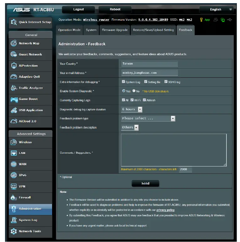 If you have encountered any problem or issue when set up or use ASUS AiMesh, please go to web GUI (http://router.asus.com), and go to page Administration Feedback.