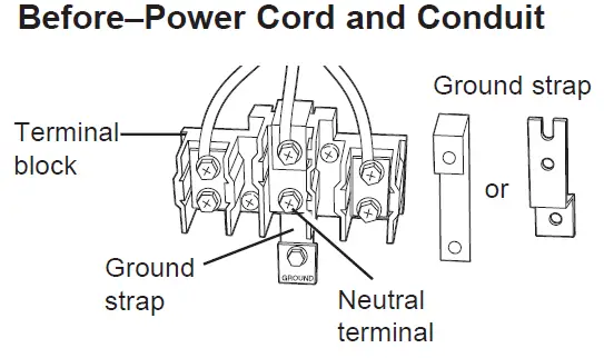 WARNING The neutral wire of the supply circuit must be connected to the neutral terminal located in the lower center of the terminal block. The power leads must be connected to the lower left and the lower right terminals of the terminal block. The grounding lead must be connected to the frame of the range with the ground plate and the green ground screw.