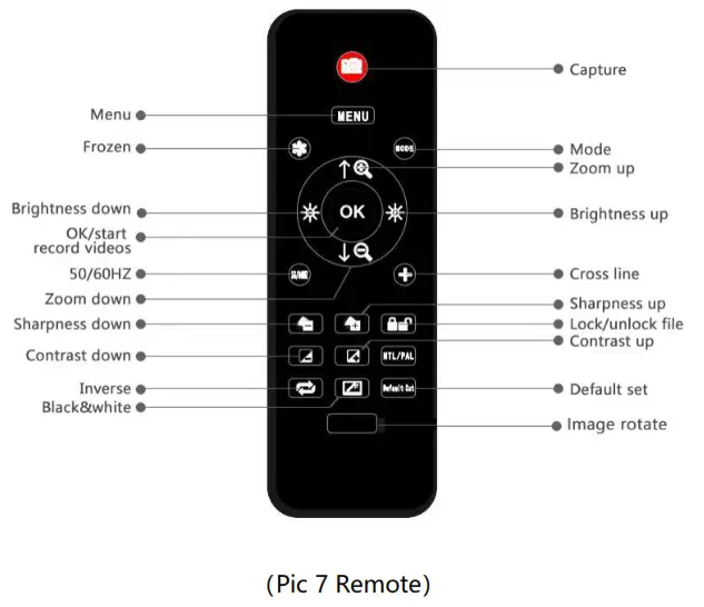 Use “Up” and “Down”to choose among “Cross Line” “Line” “Direction” “Location” “Color”and “Wide”. Use “Left”and “Right”(marked as a brightness +&- in pic 8) to change settings. The microscope can’t do this mission stand along, The remote is needed. A Cross line as its name says, it’s a pair of vertical and horizontal lines located in the very middle in the image.