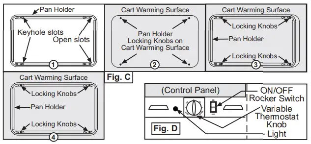 - Place pan holders (Fig. C1) over the cart’s top warming surface, with 2 keyhole slots and 2 open slots on the inside flaps of the pan holder positioned over the