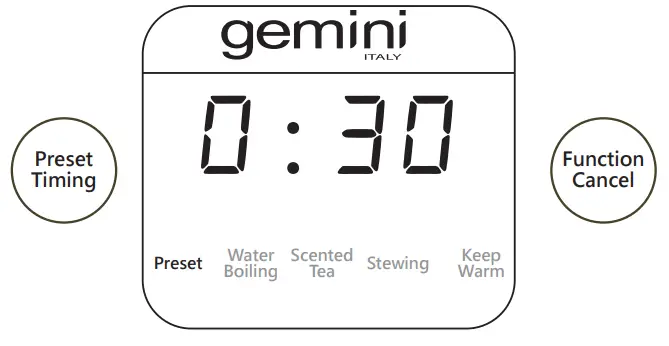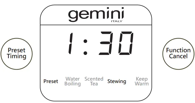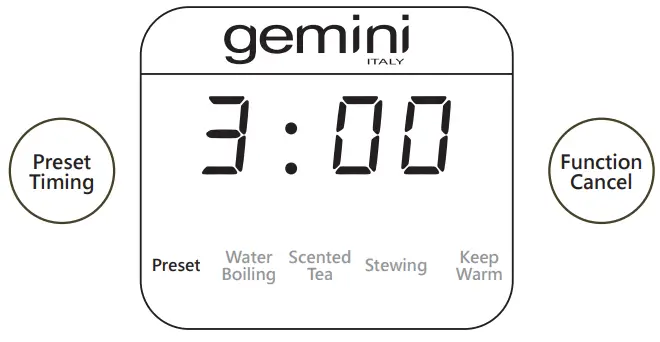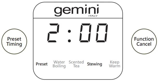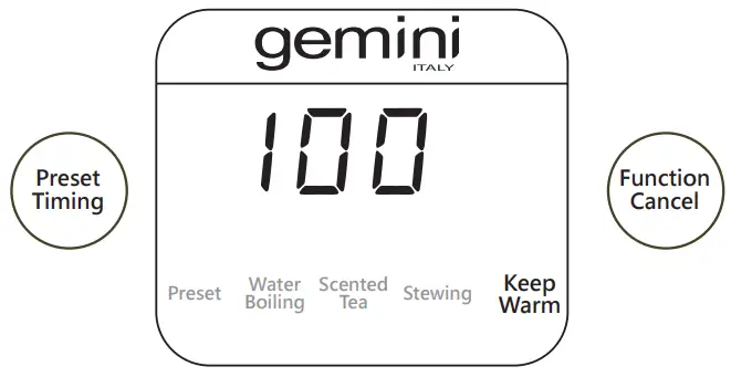 After turning on the power supply, press the “Function/Cancel” button to select the keep warm function, and repeatedly press the “Preset/Timing” button to select the required keep warm temperature. It will start keeping warm after waiting for 5 seconds without operation.