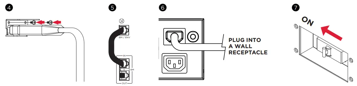 - Step 5: Connect the BM/ENV port from UPS rear panel to BM port marked “IN” on the rear panel of
