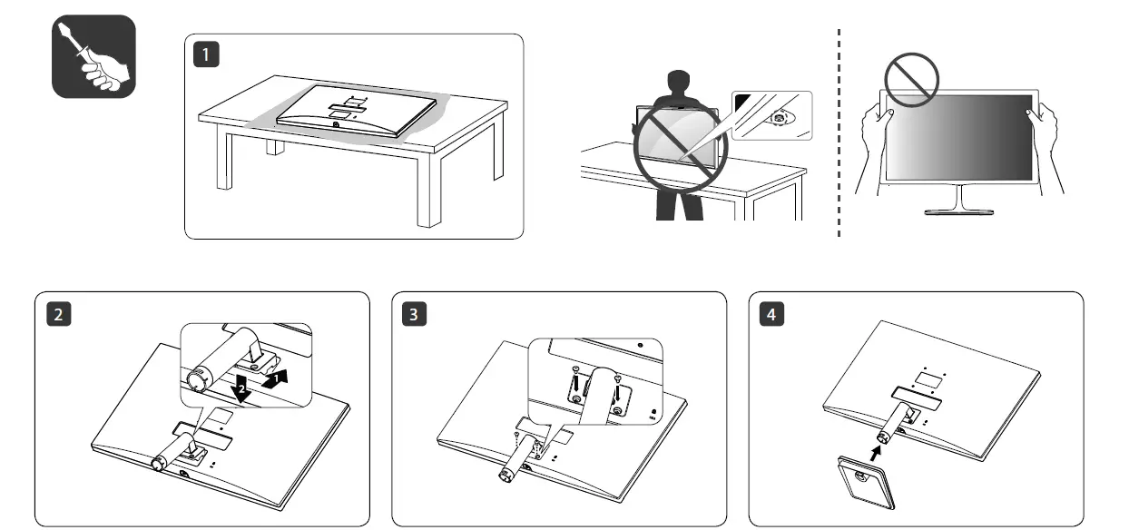 Image shown may differ from your monitor.When attaching the stand to the monitor set, place the screen facing down on a flat cushioned table or surface to protect the screen from scratches.
