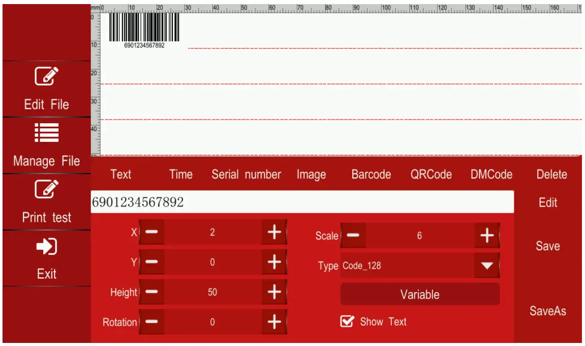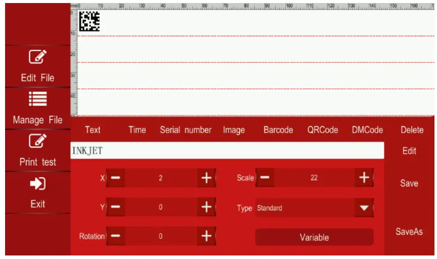 | Print content | Text, time and date, batch number, serial number, logo, QR code, barcode |