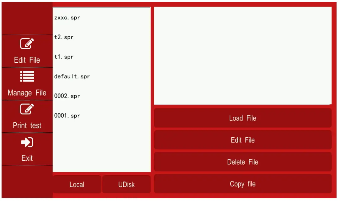 e. To move images from the USB drive to the printer – Select “Udisk” – From the list of image files, highlight one and select “copy file” – Once you have moved the image to the local drive you will be able to select it and use it in any image from the previous menu.