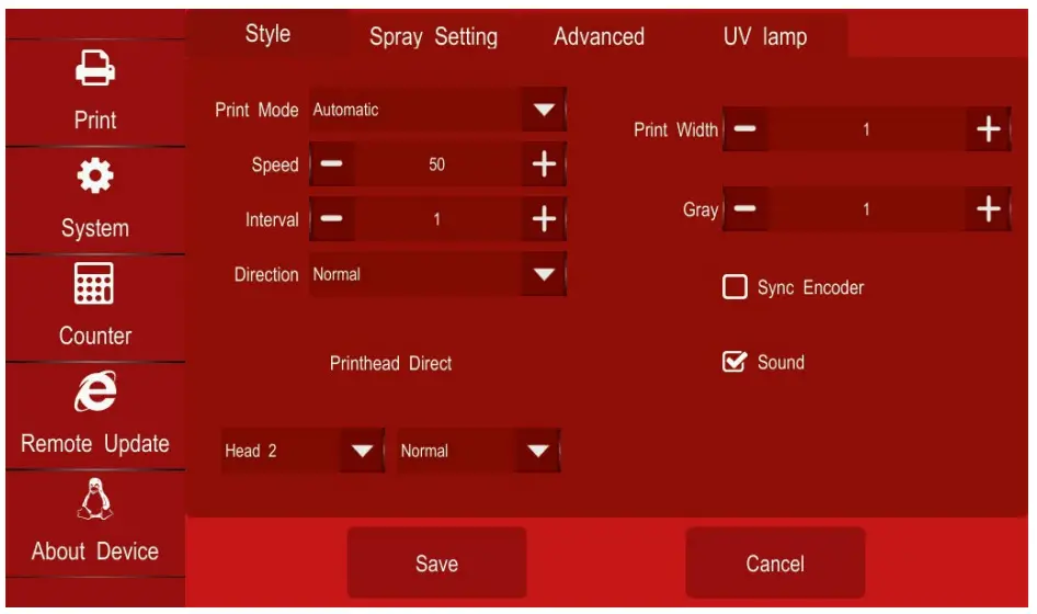 b. Speed: this setting is one of your most important and allows you to set the speed at which the printer ejects ink to match the speed of your conveyor. This can require some trial and error.