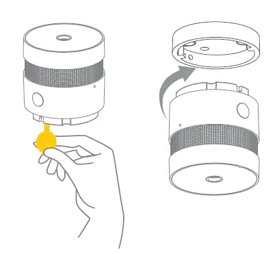 – Remove the battery insulating strip to make detector on power and clockwise rotating alarm into bracket.