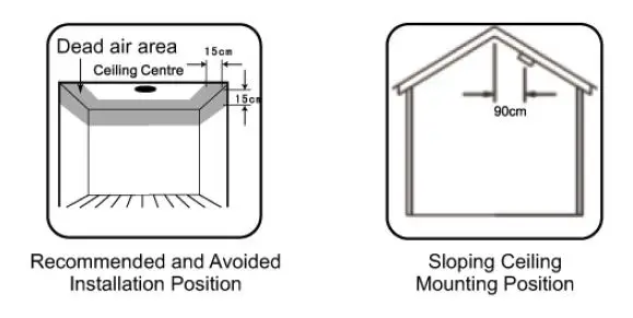 If ceiling is sloping, please install the smok sensor at horizontal distance 90 cm away from the ceiling top.