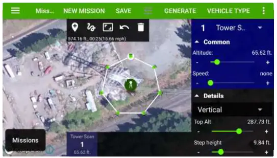 Tower Scan is a type of mission item that allows for scanning things like wind turbines, radio towers, water towers, etc. It’s meant to fly around a target at a specified radius, taking pictures (or recording video) as it goes.