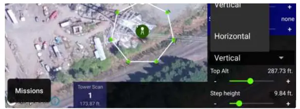 NOTICE: When setting up a Tower Scan, pay close attention to the path drawn on the map. The path will show entry into and the exit from the scan, which may not appear on the side of the tower scan you expect it too. This is because the path crosses from left to right and back during the scan, and the exit point (the one which heads to the next waypoint) will be on the side where the scan finishes. The path is clearly shown on the map, so you can avoid crossing over to a waypoint that could cause your vehicle to collide with the object you’re scanning. If you want to change the exit side of the scan, you can do so by adjusting the step height or top altitude of the scan.