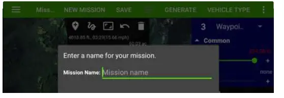 To Fly a created mission, you will need to save the mission. Click SAVE on the title area, specify a name for your mission, and click SAVE again. The mission should appear in the list you see when you select Missions.