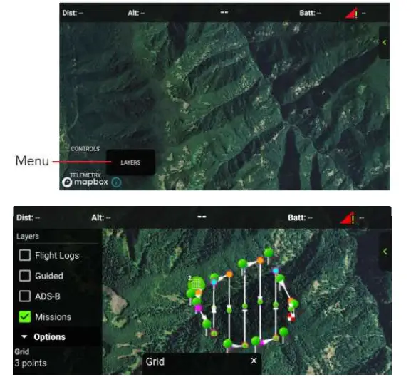 Flying missions are done from the Map view in the flight screen. In the Map view, one of the layers is Missions. Click Missions, and you’ll see a list of missions.