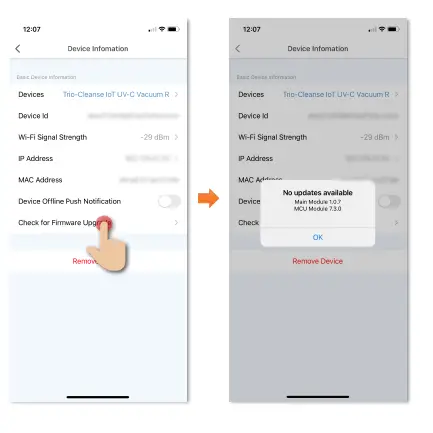Tap “Check for Firmware Upgrade”, you can see current firmware version and available upgrade version if any. Tap “Upgrade” to start firmware upgrade.