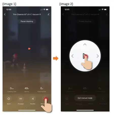 Manual control the direction to clean a specific area. (When turning left or right, the robot will drive the direction of rotation using a single wheel.) (image 1 & 2)