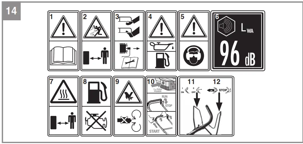 - Danger! Sharp blades – Switch off the engine and pull the spark plug boot before doing any maintenance, repair, cleaning or adjustment work.