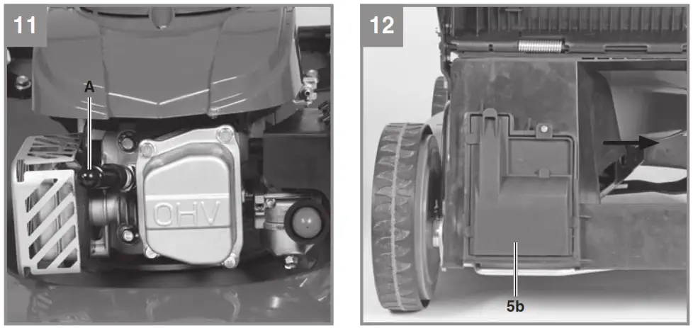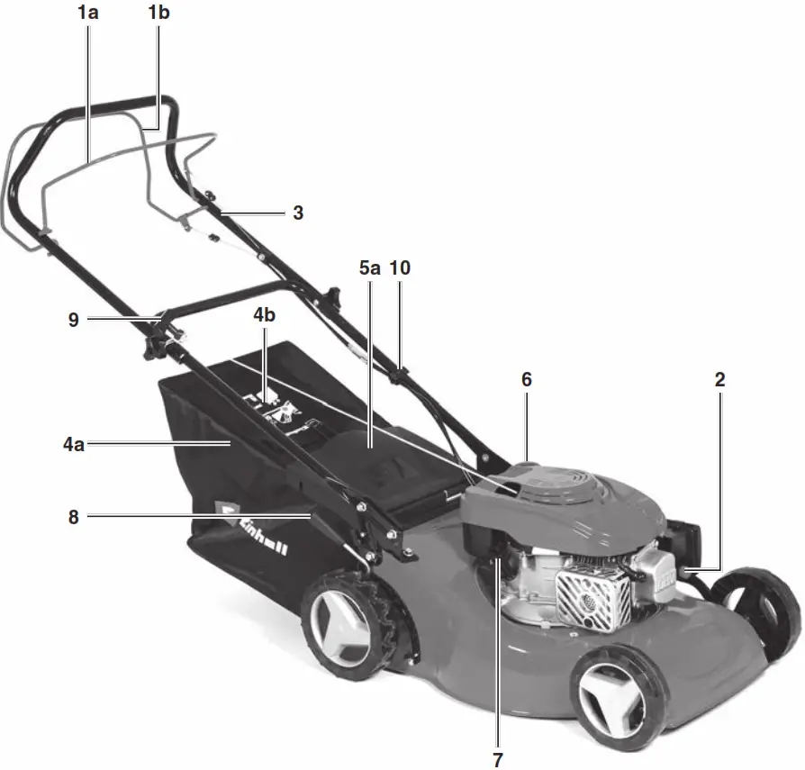 | 2.1 Layout (Fig. 1-12) 1a. Engine start/stop lever (engine brake) 1b. Drive lever (clutch lever) 2. Fuel pump (primer) 3. Top and bottom push bar 4a. Debris bag 4b. Level indicator 5a. Ejector fl ap 5b. V-belt 6. Tank fi filler cap 7. Oil fi roller screw 8. Cutting height adjustment 9. Starter cable | 10. 1x cable clip 11. Star nut (2x) 12. Long screw (2x) 13. Spark plug wrench 14. 2x screws (bottom push bar) 15. 2x screws (countersunk, bottom push bar) 16. 4x nuts (bottom push bar) 17. Eyelet |
