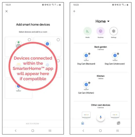 - Once connected, the app will display any compatible devices linked to your SmarterHome™ account. From here you can assign them to rooms and set up any routines.