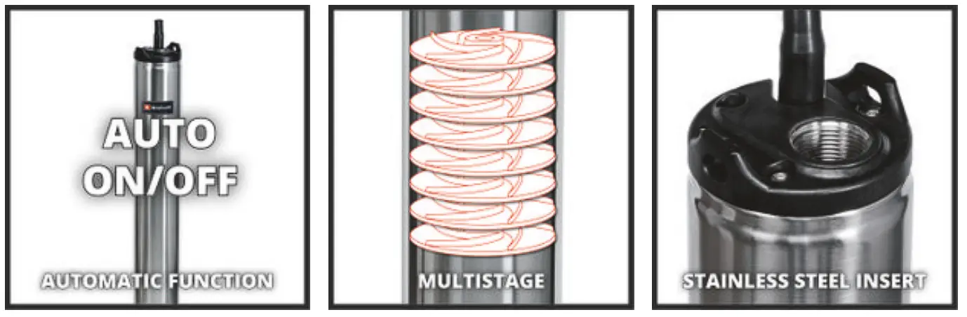 The Einhell GE-DW 1155 N-A deep well pump with automatic function switches the device on automatically when water is required and also switches it off again. The clean water can be pumped to a max. height of 55m thanks to the 8-stage impeller system. An immersion depth of max. 19m and the slimline design make the pump suitable for use in deeper lying and constricted water reservoirs as well. The powerful 1,100 W motor pumps 6,000 l/h. A long service life is guaranteed by the stainless steel housing and high-quality mechanical seal. The integrated dry-run safeguard protects the pump against damage if the water supply is interrupted. The pump is equipped with an easily accessible hose connection on the top with an integrated nonreturn valve.