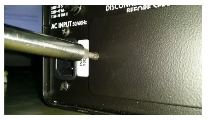 With a TORX (TX10) screwdriver, unscrew the left hand screw near the AC input connector.