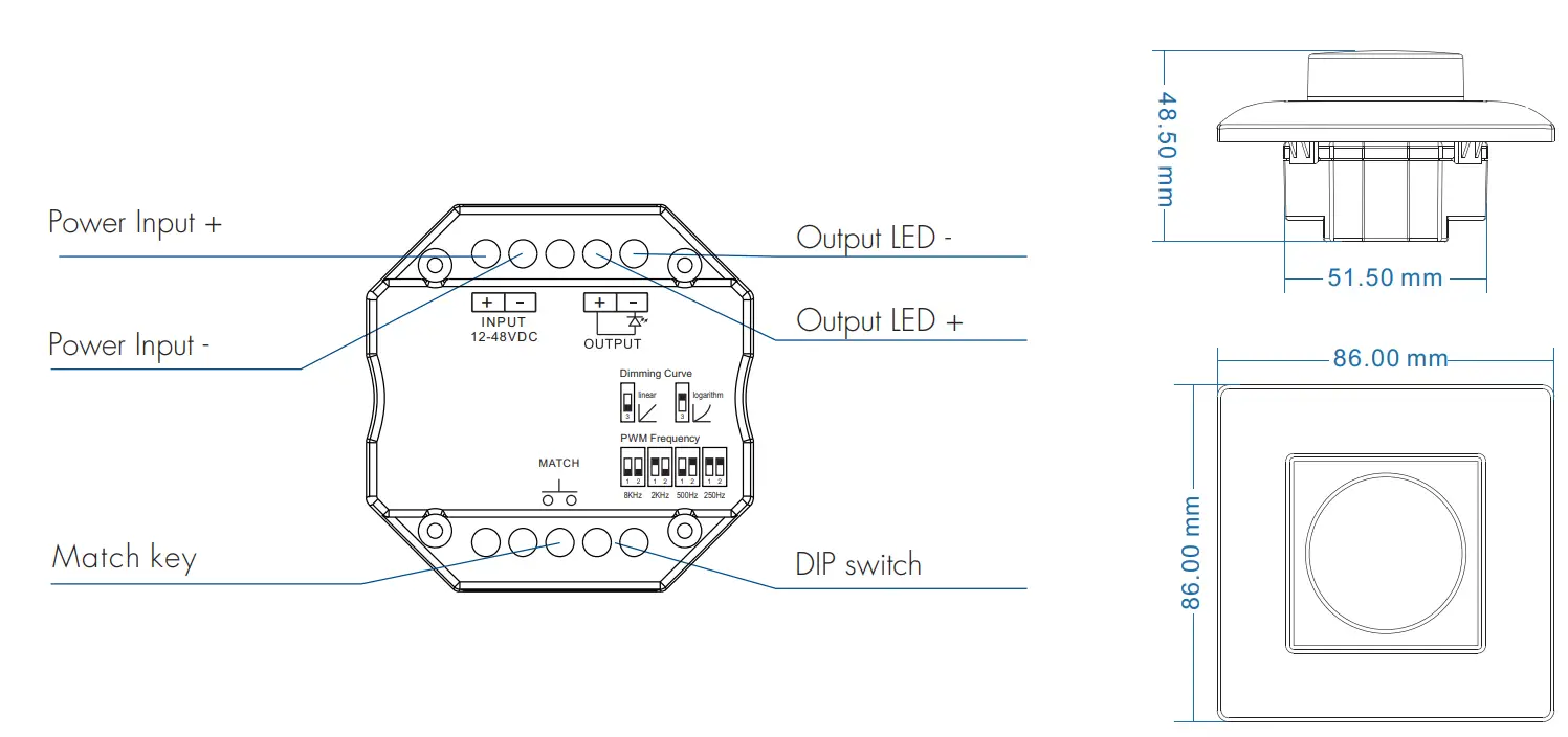 - Logarithmic or linear dimming curve selectable.