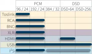 - PCM Audio up to 384 kHz sampling rate and 32 bit word lengths supported