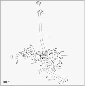 - Attach the Base Frame (01) to Upright support tube (02) and tighten by X2 hex Head Bolt (27), X4 Flat Washer (34) and X2 Nylon Nuts (39).