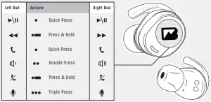 Manual Pairing Mode= Press and hold tor five seconds when oft (Note: Volume and track controls do not work during one-bud listening)