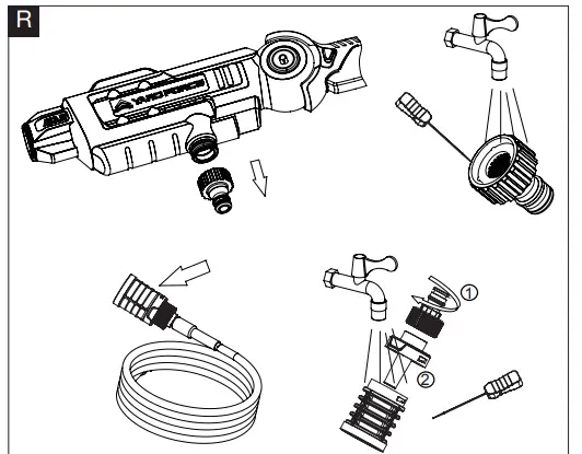 - Using the Aquajet with your garden hose pipe – attach the hose pipe to the Aquajet connector and make sure that it is locked into position