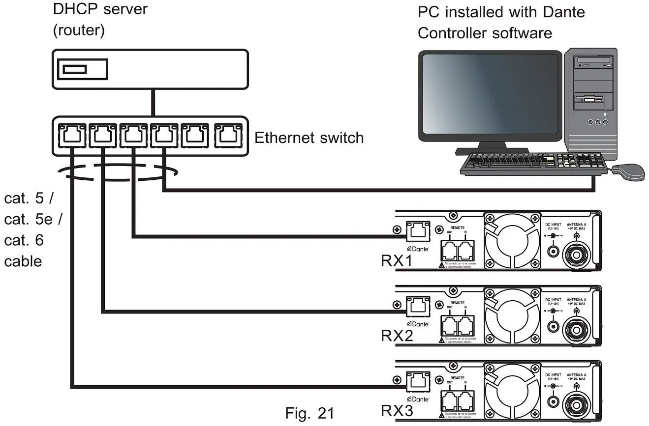 (B) The Ethernet switch needs to be connected with a DHCP server (e.g. router) to provide DHCP function. - Software Operating Instructions: Install Dante Controller on PC to perform audio stream routing and monitoring.