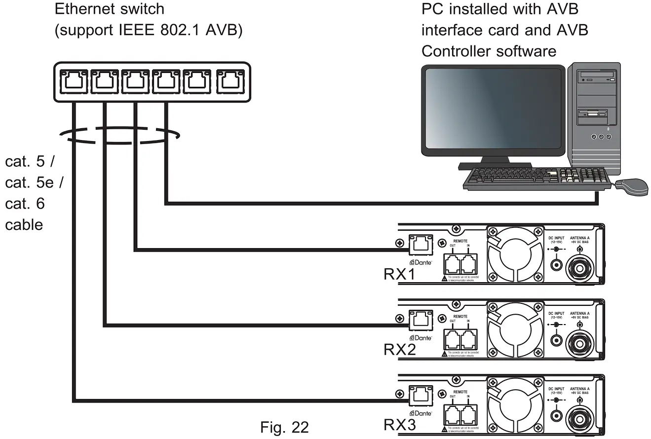 (B) This Ethernet switch should be able to support IEEE802.1 AVB. - Software Operating Instructions: Install AVB Controller on PC to perform audio stream routing and monitoring.