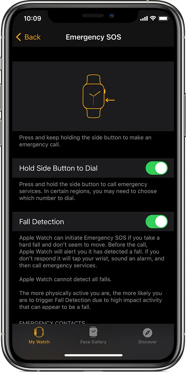 After the call ends, your watch sends a message to your emergency contacts with your location letting them know that your watch detected a hard fall and dialed emergency services. Your watch gets your emergency contacts from your Medical ID.